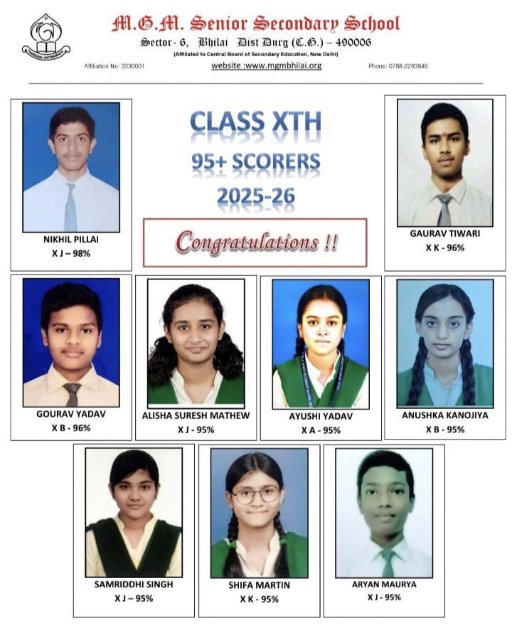 एम.जी.एम. सीनियर सेकेंडरी स्कूल, सेक्टर-6, भिलाई ने एक बार फिर सत्र 2025–26 के सीबीएसई कक्षा 10 बोर्ड परीक्षा में उत्कृष्ट शैक्षणिक प्रदर्शन करते हुए अपनी श्रेष्ठता सिद्ध की है। विद्यालय ने शानदार परिणाम प्राप्त किए, जिसमें सभी 403 पंजीकृत विद्यार्थियों ने परीक्षा में भाग लिया तथा एक भी छात्र अनुपस्थित नहीं रहा।